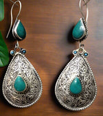 The earrings' classic teardrop shape is encircled by exquisite filigree engravings that are reminiscent of South and Central Asian jewelry traditions' ornamental designs. A gorgeous turquoise-blue synthetic topaz stone in the shape of a teardrop sits at the center of each piece, blending in perfectly with the surrounding brass work.