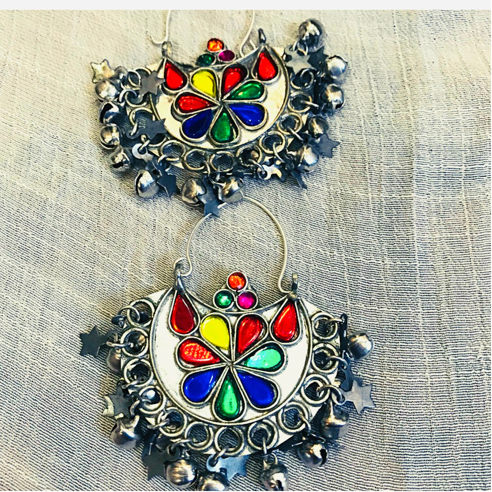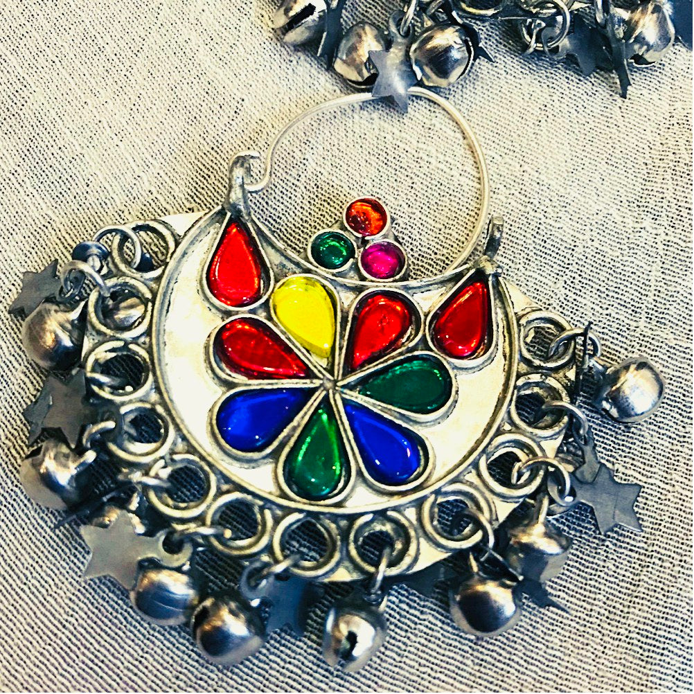 Each piece in this set tells a story of cultural richness and artistic mastery. Sourced from Afghanistan and meticulously crafted using traditional Pashtun techniques, this jewelry represents genuine tribal artistry that has been passed down through generations. The vibrant multicolored glass gemstones catch and reflect light beautifully, creating an eye-catching display that honors the bold aesthetic of gypsy-inspired design.