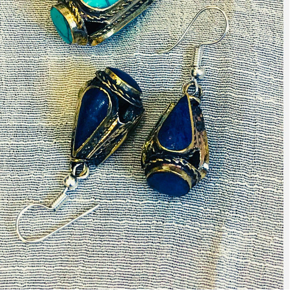 Discover the timeless beauty of these authentic Antique Kuchi Gypsy Tribal Earrings, featuring stunning natural lapis lazuli and vibrant synthetic turquoise stones. Each piece tells a story of nomadic craftsmanship and ancient traditions.